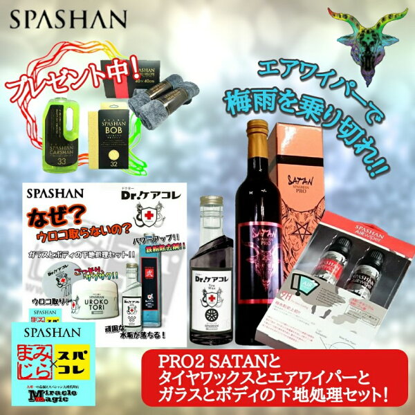SPASHAN エアワイパー梅雨を乗り切れ!スパシャンプロ2 SATAN エアワイパー ウロコ取り アイアンバスター2 水垢取り タイヤワックス カーシャンとBOBとマイクロベロアプレゼント 通常販売しているスパシャンシリーズの最高位!スパシャンプロ【a.s.o】がリニューアル! その名は 【SATAN】 もちろん全てがパワーアップ! ガラスコーティングはこれで決定! ビン上部のシュリンクキャップはゴールドとレッドがございます。