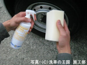 付属の『ユーティリティースポンジ』に『タイヤワックス』をスプレーし、 塗り伸ばしていきます。